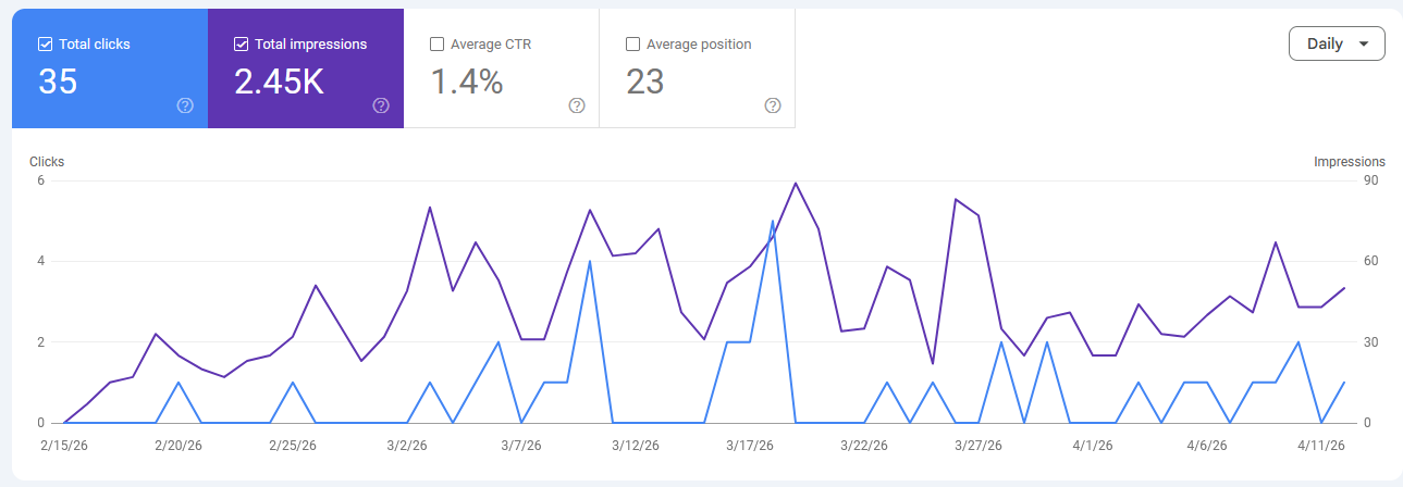 Projekt je pokrenut prije otprilike mjesec dana, sredinom veljače 2026. Par statistika sa Google Search Console: